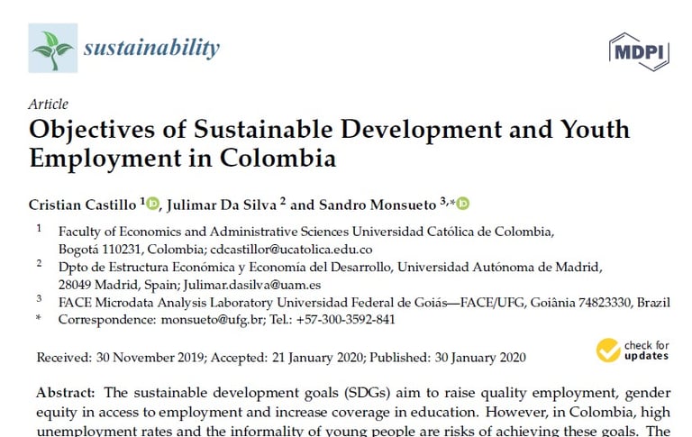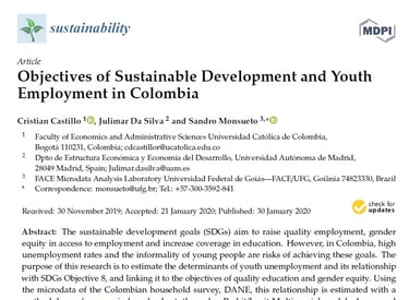 Castillo, C., Da Silva, J., & Monsueto, S. (2020). Objectives of sustainable development and youth employment in Colombia. Sustainability, 12(3), 991.
