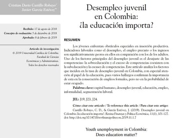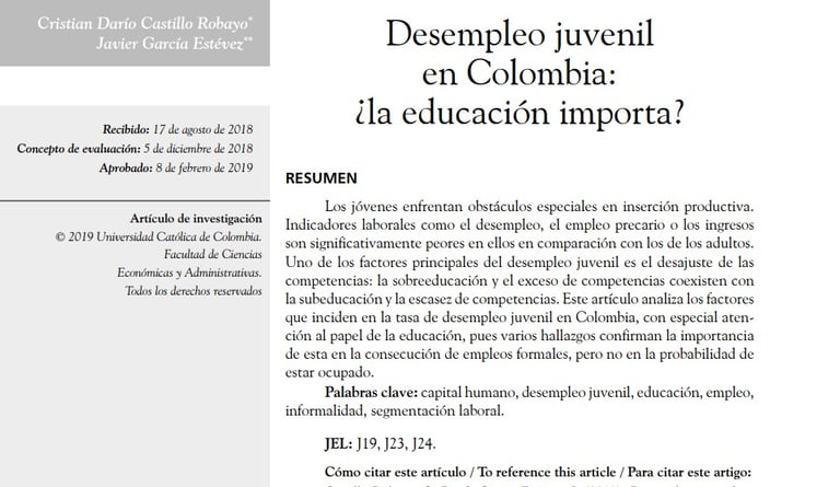 Castillo-Robayo, C. D., & García-Estévez, J. (2019). Desempleo juvenil en Colombia:¿ la educación importa?. Revista Finanzas y Política Económica, 11(1), 101-127.