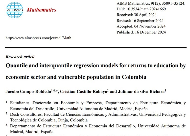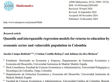 Campo-Robledo, J., Castillo-Robayo, C., & da silva Bichara, J. (2024). Quantile and interquantile regression models for returns to education by economic sector and vulnerable population in Colombia. AIMS Mathematics, 9(12), 35091-35124.