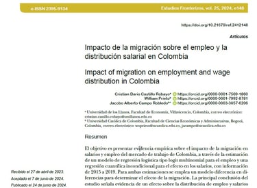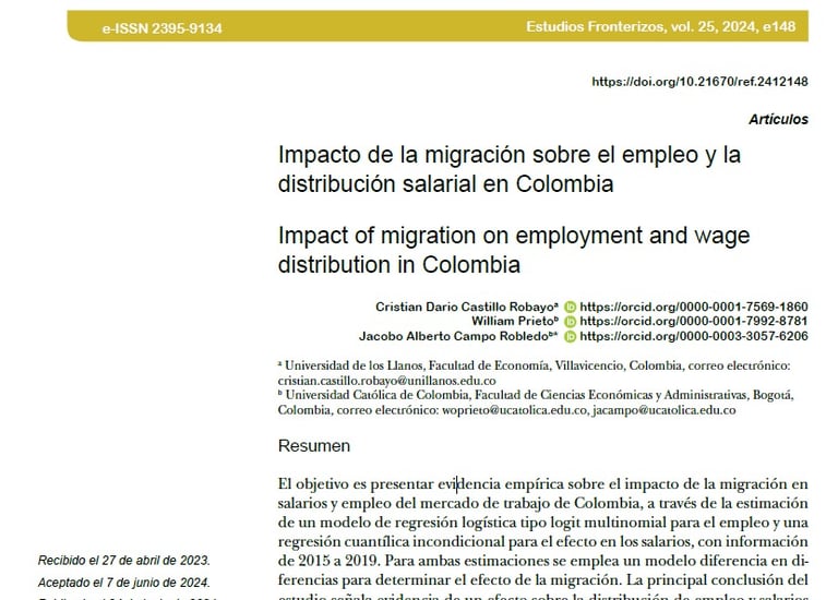 Robayo, C. D. C., Prieto, W., & Robledo, J. A. C. (2024). Impacto de la migración sobre el empleo y la distribución salarial en Colombia. Estudios Fronterizos, (25), 12. 2024