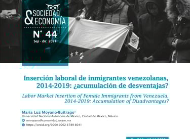 Moyano-Buitrago, M. L. (2021). Inserción laboral de inmigrantes venezolanas, 2014-2019:¿ acumulación de desventajas?. Sociedad y Economía, (44). Núm. 44 (2021): Número 44 (Septiembre - Diciembre 2021). e-ISSN: 2389-9050 / e10410743.