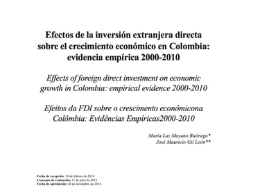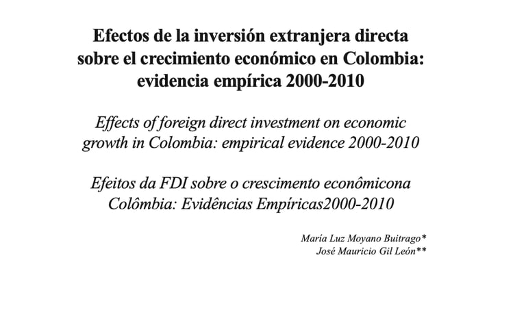 Moyano Buitrago, María Luz; Gil León, José Mauricio (2015). Efectos de la inversión extranjera directa sobre el crecimiento económico en Colombia: evidencia empírica 2000-2010. Revista Apuntes del CENES, vol. 34, núm. 59, enero-junio, 2015, pp. 63-91. Universidad Pedagógica y Tecnológica de Colombia. Boyacá, Colombia. ISSN: 0120-3053.