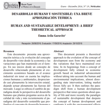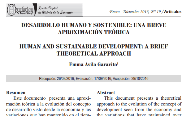 Ávila, Emma. (2016). Desarollo Humano y Sostenible; una breve aproximación teórica. Revista Heurística. Universidad de Los Andes, Venezuela. ISSN-e 1690-3544, No. 19 -2016.