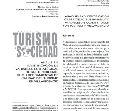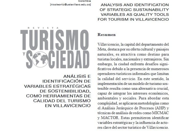 Vargas, O., Ortiz, N., Ávila, E., Ávila H. (2025). Análisis e identificación de variables estratégicas de sostenibilidad, como herramientas de calidad del turismo en Villavicencio. Universidad Externado de Colombia RevistaTurismo y Sociedad, Vol. XXXVI, pp. 251-275. DOI: https://doi.org/10.18601/01207555.n36.10