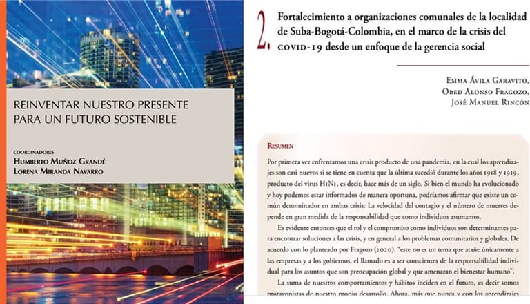 Avila, Emma; Fragozo, Obed; Rincón, José (2023). Capítulo de Libro: Fortalecimiento a organizaciones comunales de la localidad de Suba- Bogotá-Colombia, en el marco de la crisis del COVID-19 desde un enfoque de Gerencia Social. Universidad Anahuac, México https://accesoabierto.anahuac.mx/accesoabierto/publicaciones.php?Accion=Informacion&Pub=161