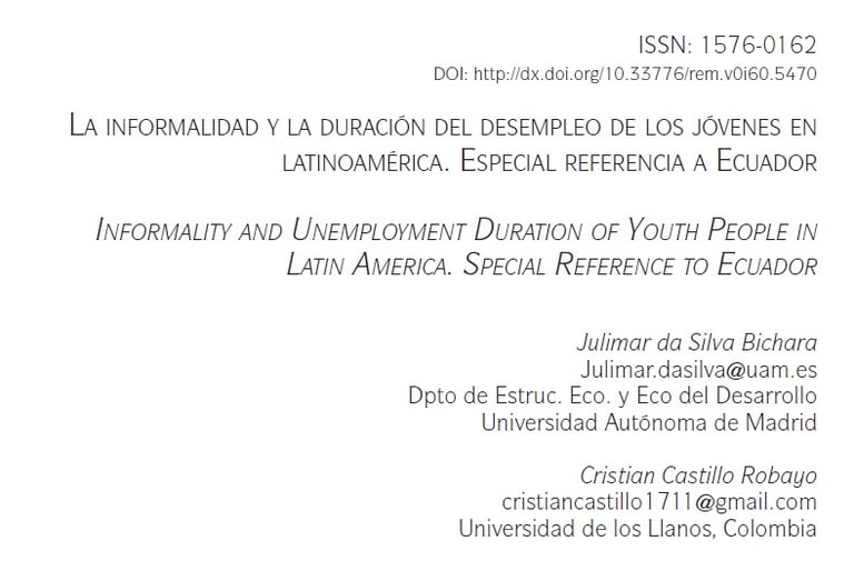Julimar Da Silva Bichara, Cristian Castillo Robayo, Jorge Luis Delgado (2021). "LA INFORMALIDAD Y LA DURACIÓN DEL DESEMPLEO DE LOS JÓVENES EN LATINOAMÉRICA. ESPECIAL REFERENCIA A ECUADOR"