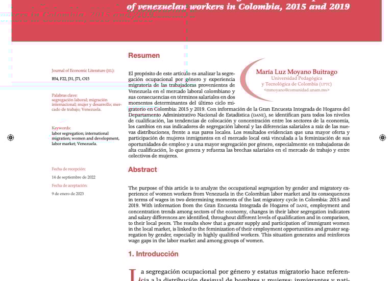 Buitrago, M. L. M. (2023). Segregación ocupacional por razón de género y estatus migratorio: experiencia de trabajadoras venezolanas en Colombia entre 2015 y 2019. Economía UNAM, (58), 67-92. https://doi.org/10.22201/fe.24488143e.2023.58.767. Economía UNAM, ISSN 1665-952X, ISSN-e 2448-8143, Nº. 58, 2023, págs. 67-92.